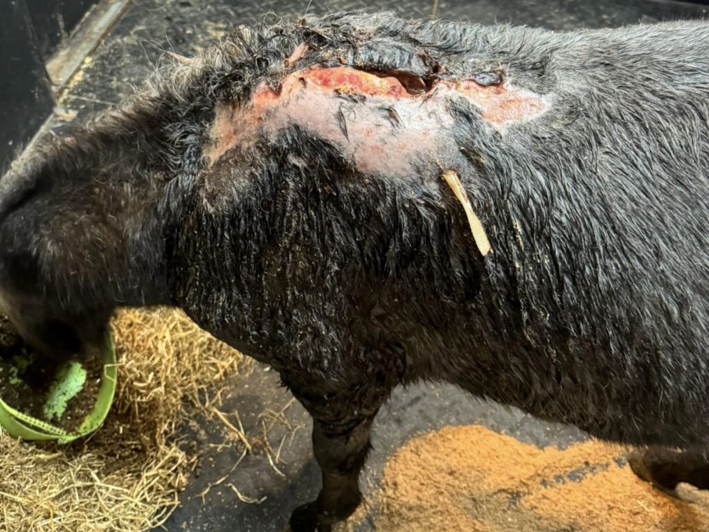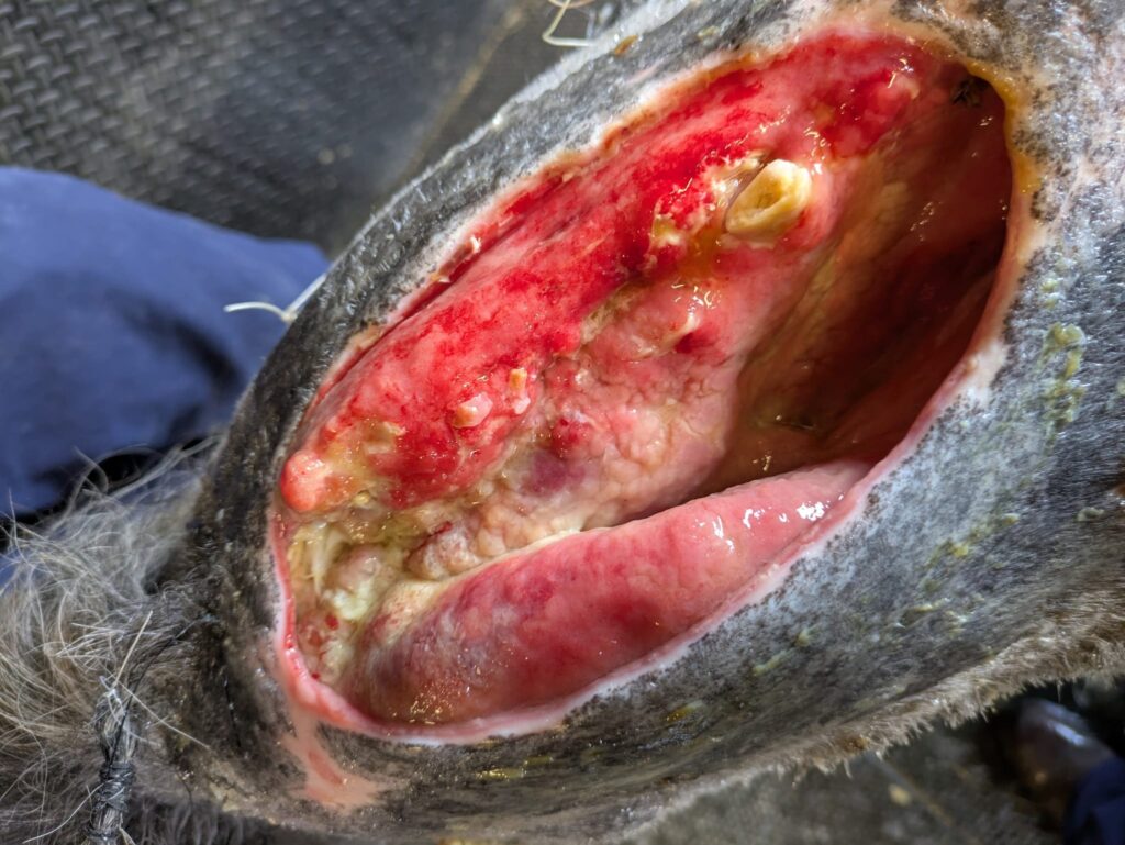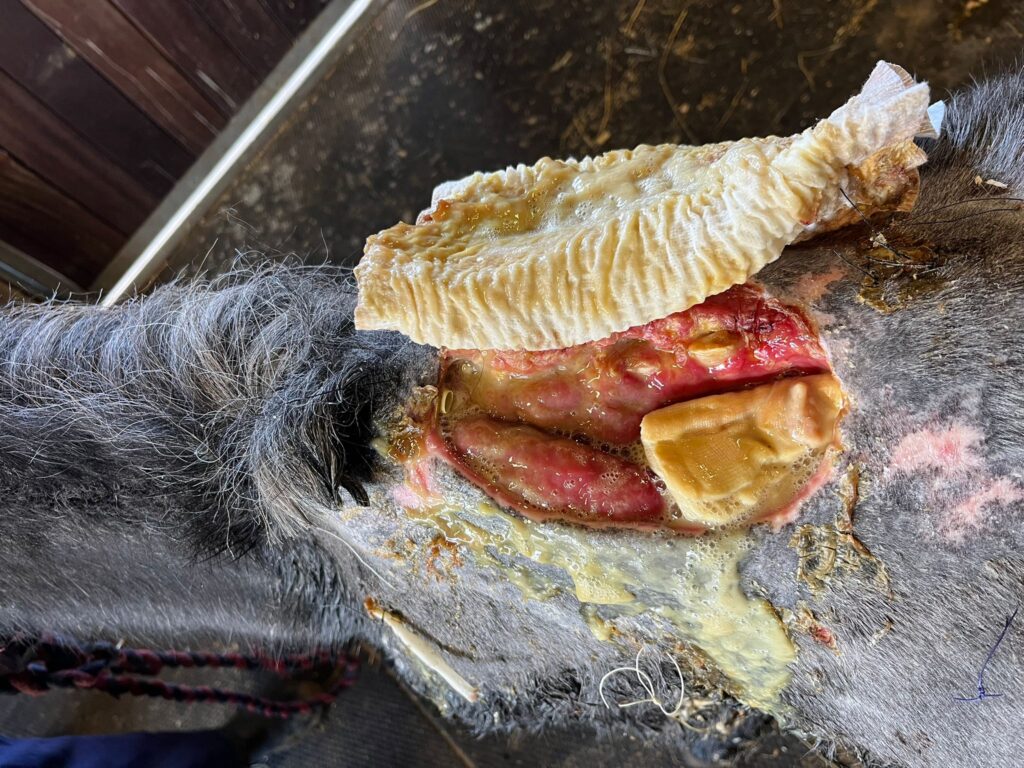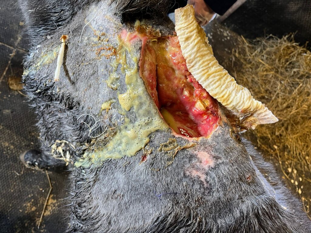 They started by surgically removing unhealthy tissue and placing sterilised gauze into the wound, with cotton swabs tied to the sutures to keep the hole covered. Olive’s dressings were changed every day for weeks and over time her treatment plan was adapted as she began to heal, and the previously large open wound became smaller and shallower. She also needed to eat with her head as low as possible to prevent the top part of her wound from healing too tight.