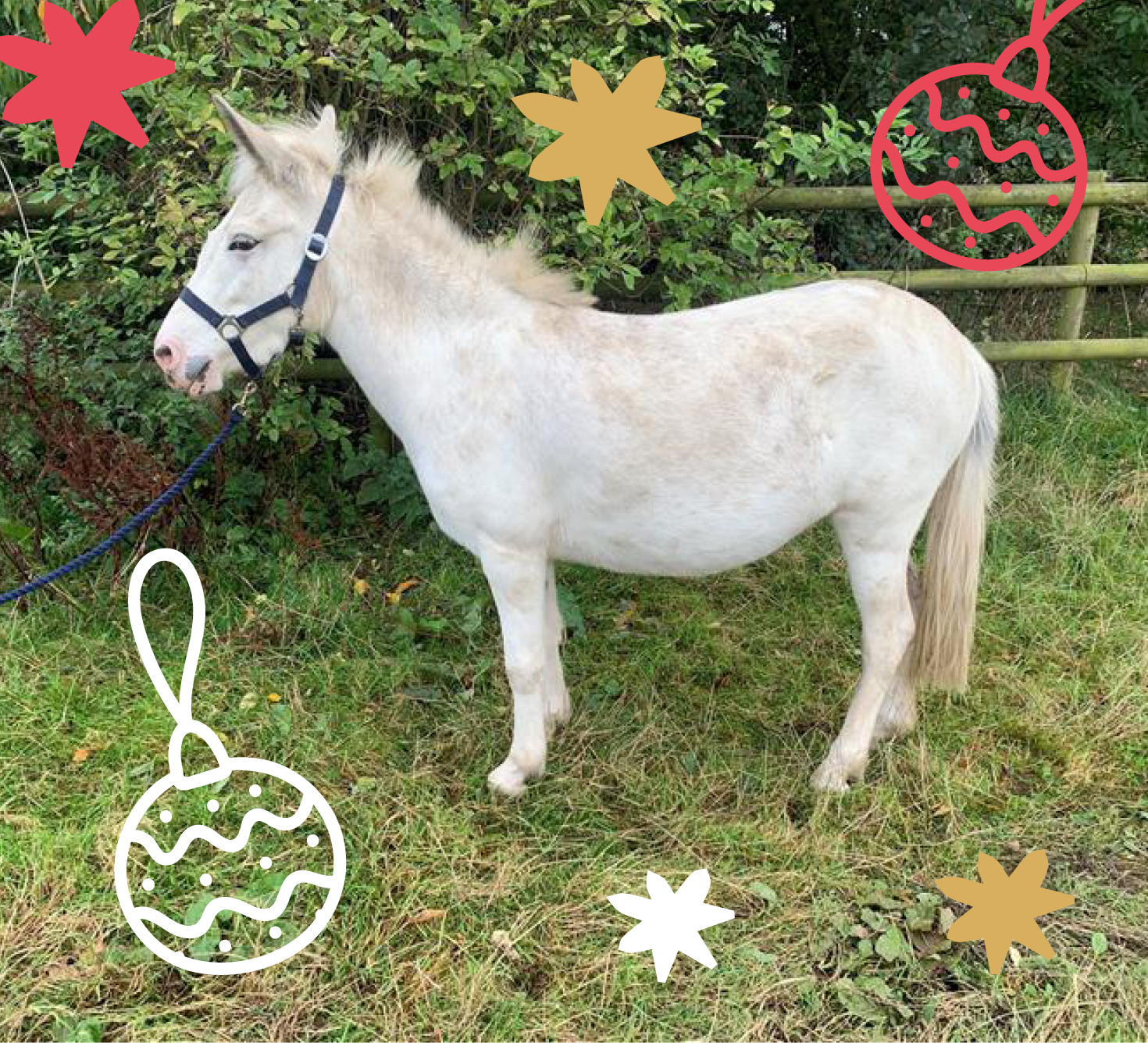 Snowflake is a beautiful girl inside and out. She always lets you know how she feels and can be opinionated in some matters (as you would expect with a mule!) She loves having fuss, scratches and attention from her handlers as well as going on in-hand walks to explore and say hello to the other horses, ponies and donkeys she passes. While being clipped, she has been known to rest her head on the shoulder of the person clipping her and have a snooze. Despite having beautiful ears, Snowflake would prefer not to have these touched – a girl has to have some boundaries after all!