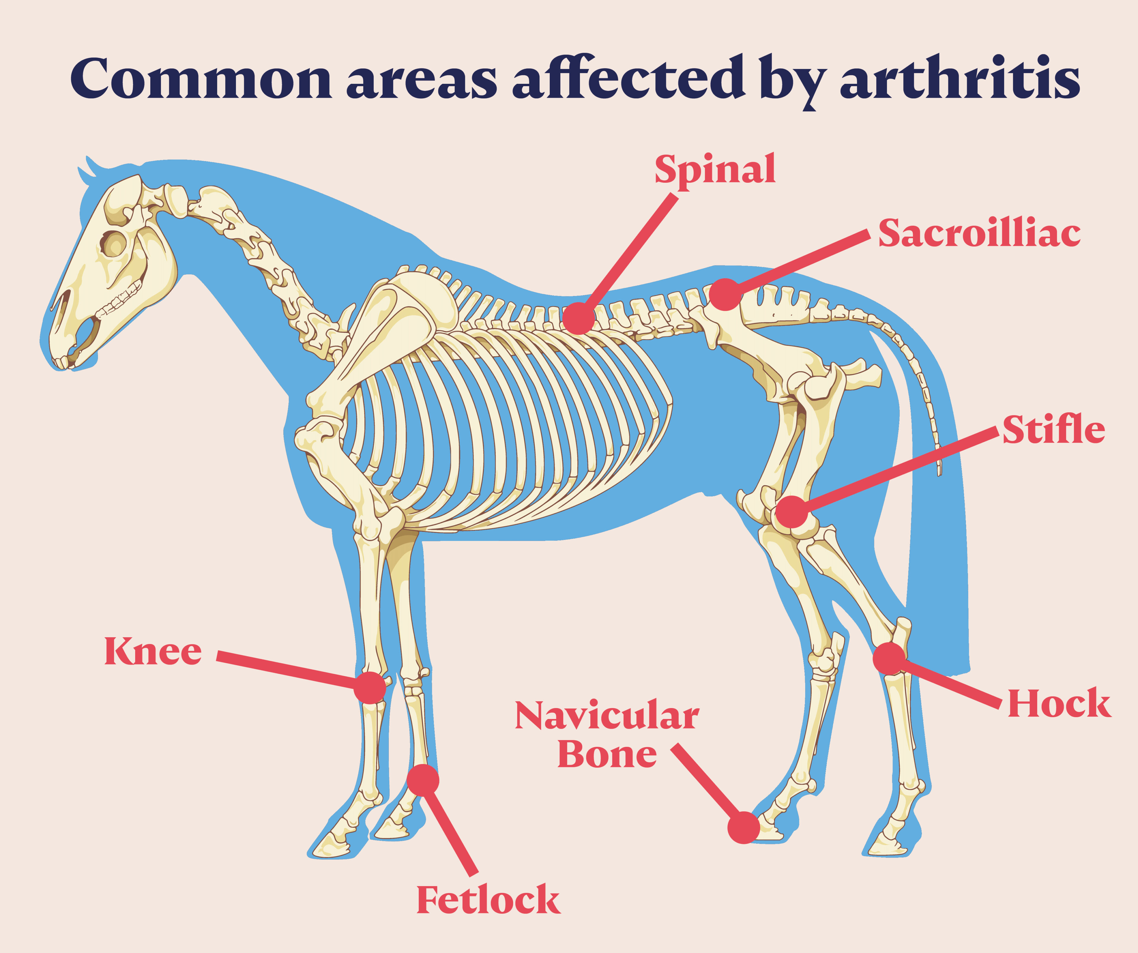 Arthritis is described as inflammation of a joint. The most common type in horses is Osteoarthritis or degenerative joint disease. Arthritis is found mainly in older equines, but it can affect any equine at any age for various reasons. It is non-reversible but with changes in management the equine can be kept more comfortable. Other types of arthritis include septic, traumatic, rheumatoid and Osteochondritis Dissecans.