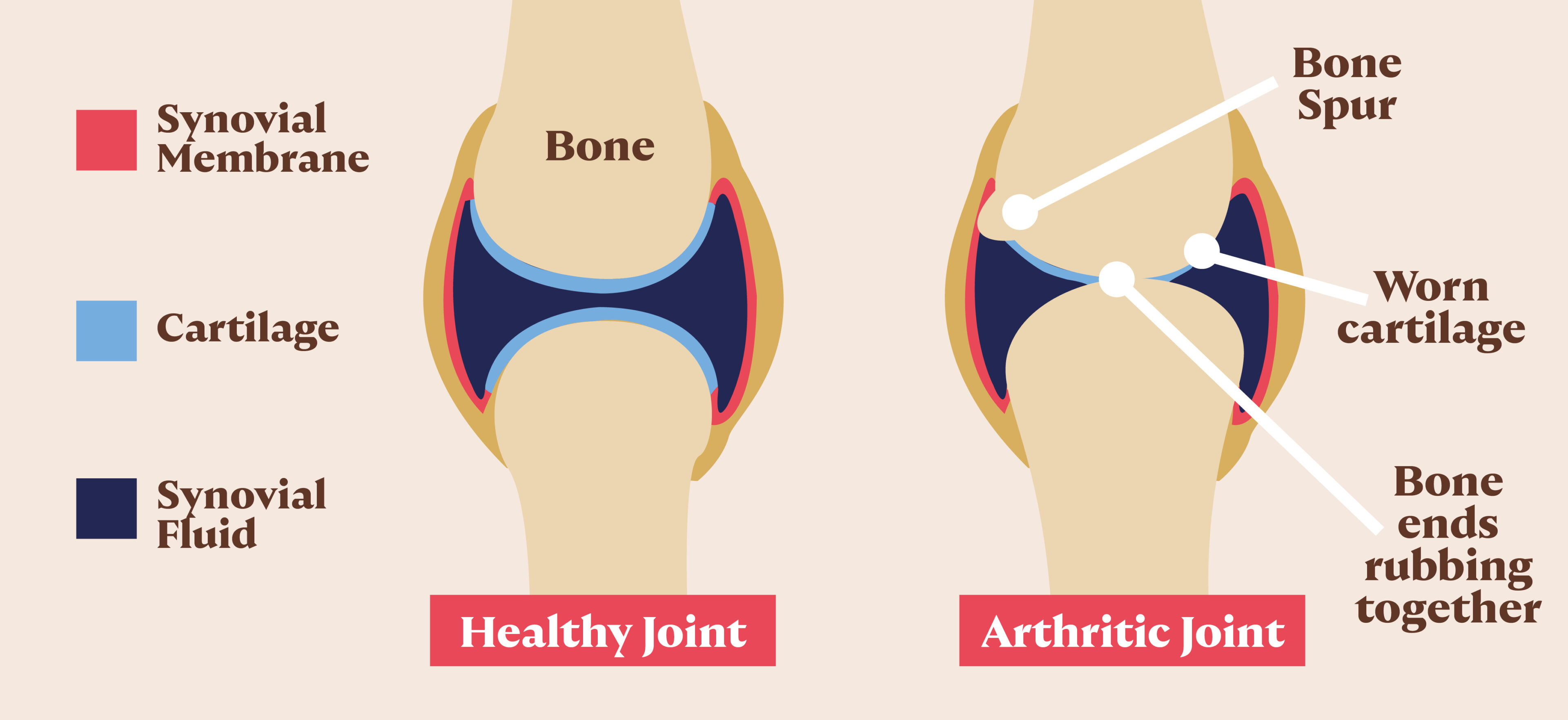 In a joint, the ends of the bones are covered with cartilage, which is a smooth protective tissue that helps reduce friction as joints move. In arthritic joints the cartilage can wear away or become damaged, resulting in inflammation and pain.